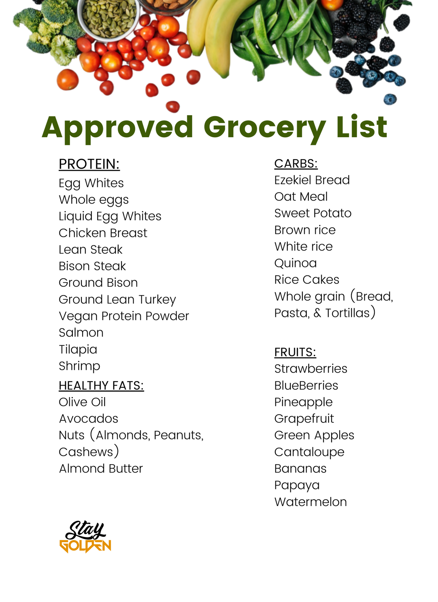 and because abs are also made in the kitchen, we've added in a Macro Cheat Sheet, and the Stay Golden Approved Grocery List to help you build aesthetically pleasing abdominals.